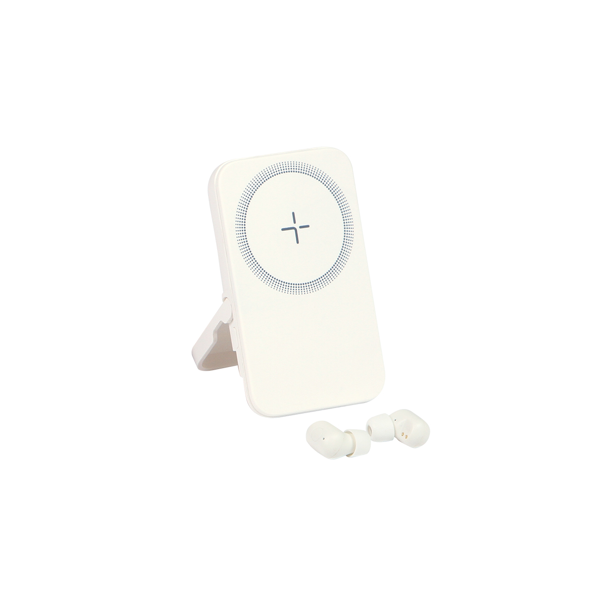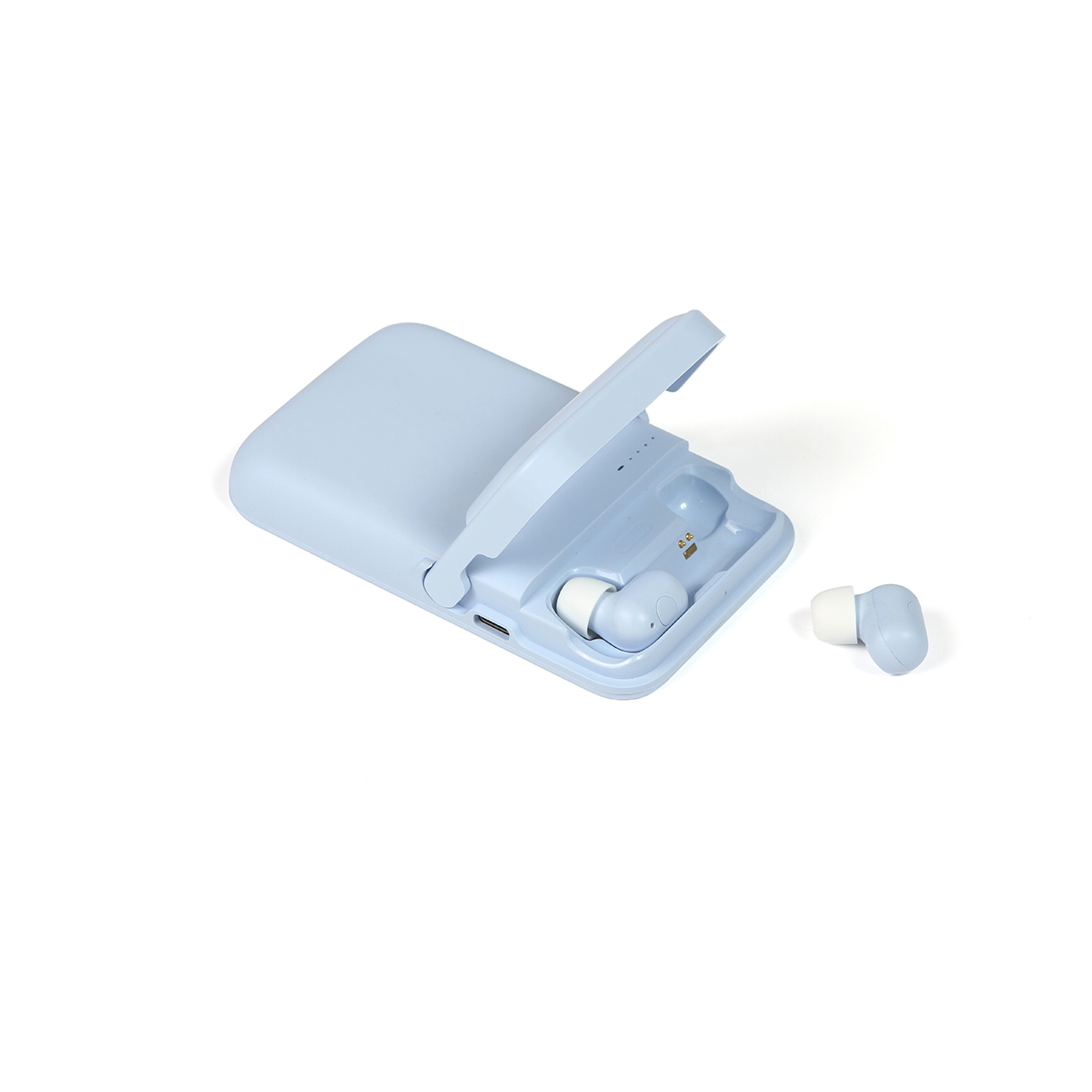 Power Bank Nauders. - Power bank fabricado en plástico ABS acabado en goma suave al tacto, batería de 3.7V 5000mAh, salida de carga 10W, 7.5W y 5W. Tiene luz led para indicar el nivel de batería, el puerto de carga es tipo C. Incluye audífonos, batería incorporada de 30 mAh para los auriculares, operación touch.