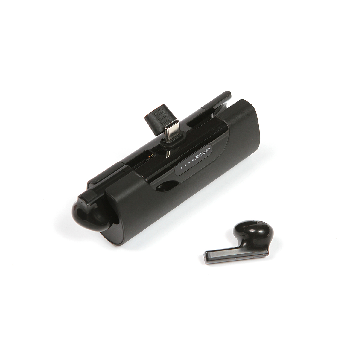 Audífonos inalámbricos Sens. - Audífonos inalámbricos con power bank fabricados en plástico ABS batería principal 1,300 mAh y batería de los audífonos 25 mAh. Tiempo de carga de los audífonos 1 hora, tiempo de reproducción a volumen medio de 3 a 4 horas. Distancia de transmisión libre de obstáculos 10 metros aproximadamente. Puerto de carga tipo C.