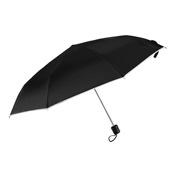 Paraguas Parma. - Paraguas de bolsillo en poliéster con 8 gajos, con lindo detalle color blanco al borde del mismo y en la parte inferior, con asa en la parte de mango (el cual es retráctil) para colgarlo y para mayor comodidad al momento de almacenarlo o transportarlo. Incluye funda, esta misma tiene un detalle color plata en la parte superior.
