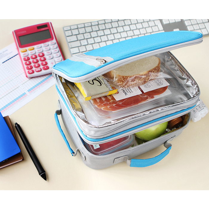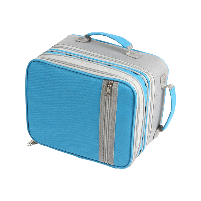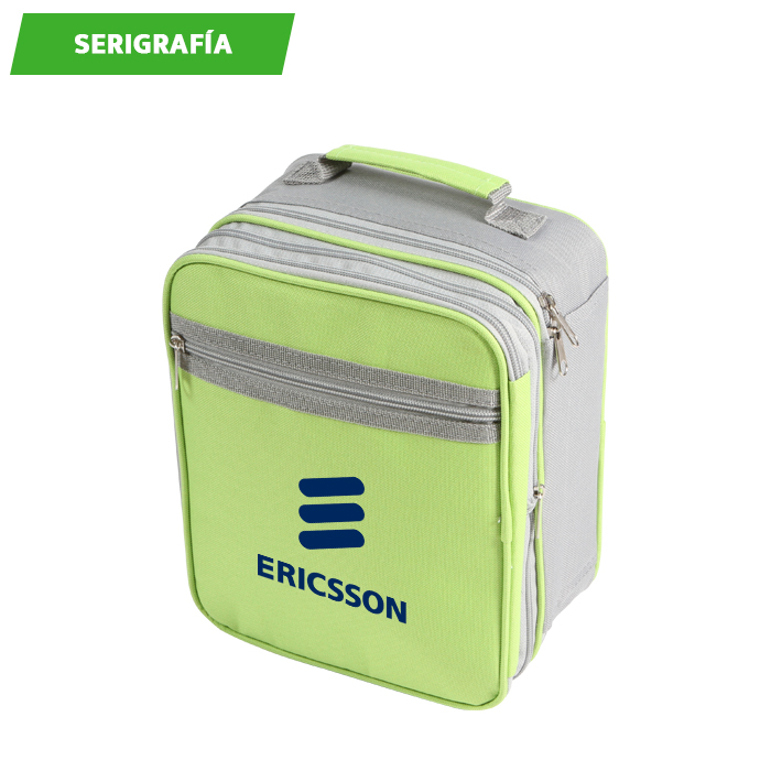 Lonchera doble. - Lonchera fabricada en poliéster con forro térmico para mantener los alimentos por un largo tiempo. Cuenta con: 2 compartimentos, cierre expandible, bolsa frontal con cierre y doble asa.
