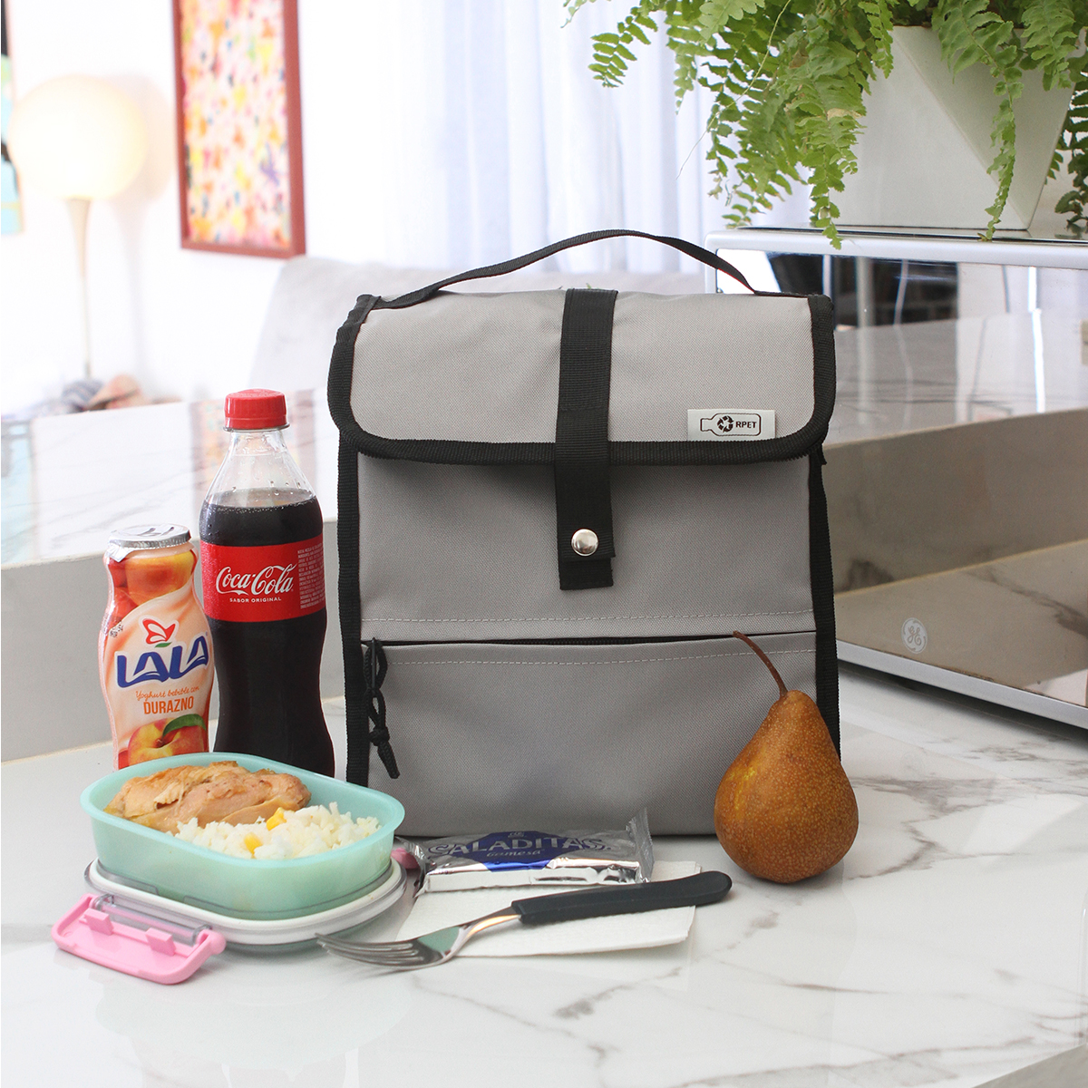 Lonchera de RPET Altái. - Lonchera térmica fabricada en poliéster reciclado (RPET), con 2 formas de cerrar, bolsillo frontal con cierre y asa superior. Esta bolsa es ideal para mantener tus alimentos frescos y en buen estado.  El RPET es un material resistente y duradero que puede soportar el uso diario y el desgaste, lo que lo hace ideal para productos textiles. Además es sostenible porque utilizan materiales reciclados en su fabricación, lo que reduce la cantidad de residuos y disminuye el impacto ambiental.