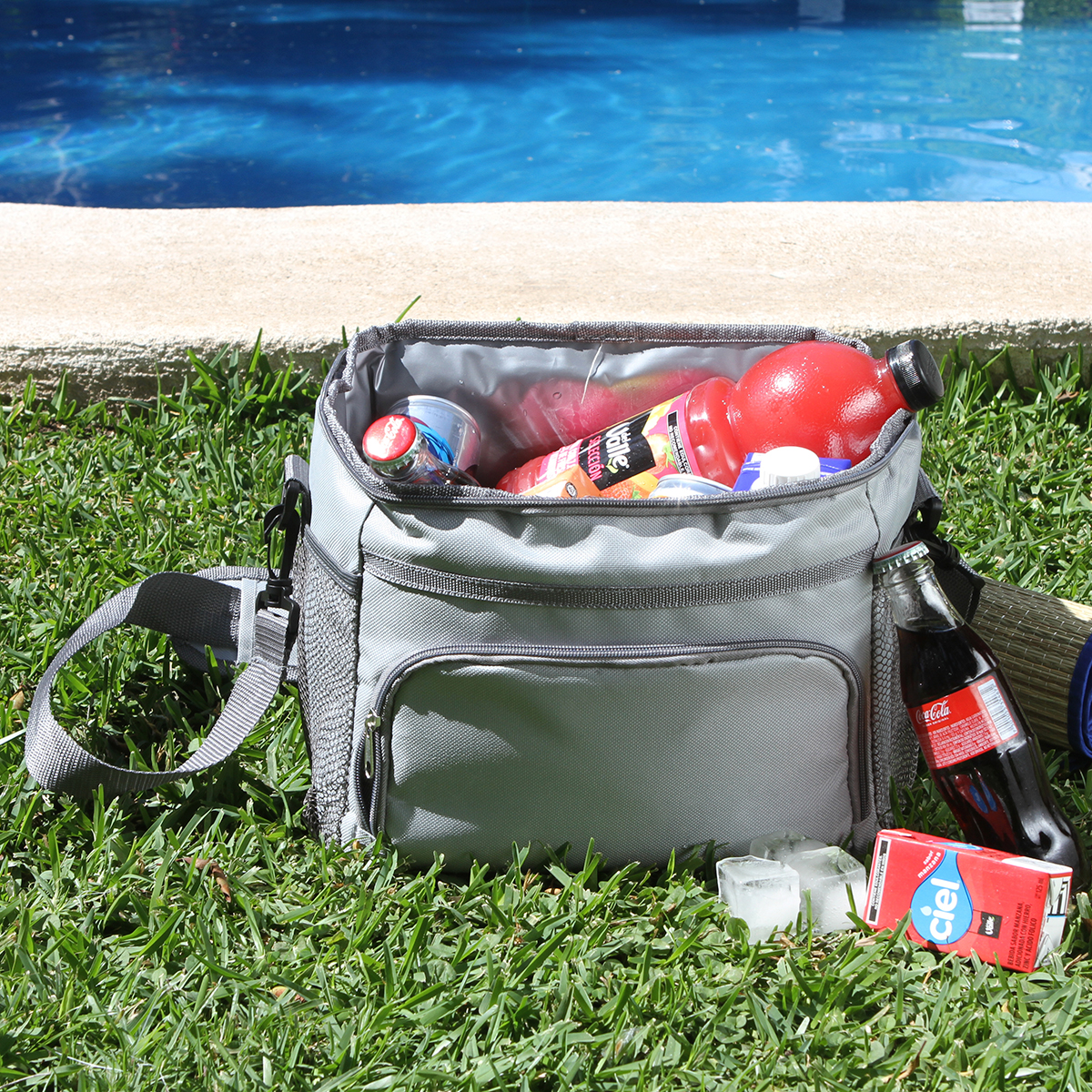 Hielera Venere. - Hielera / Lonchera térmica fabricada en poliéster con forro de PU; con bolsillo frontal con cierre, bolsillos laterales de malla, asa superior con refuerzo en las orillas y correa para el hombro ajustable, la cual es desmontable.