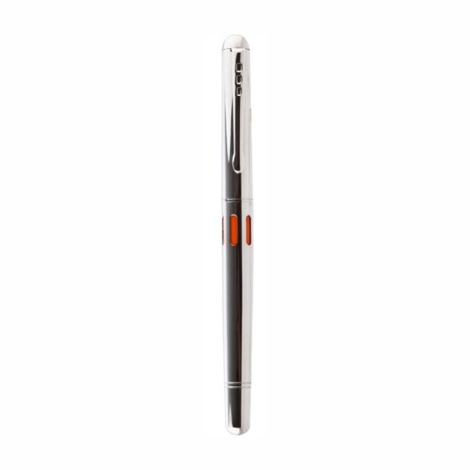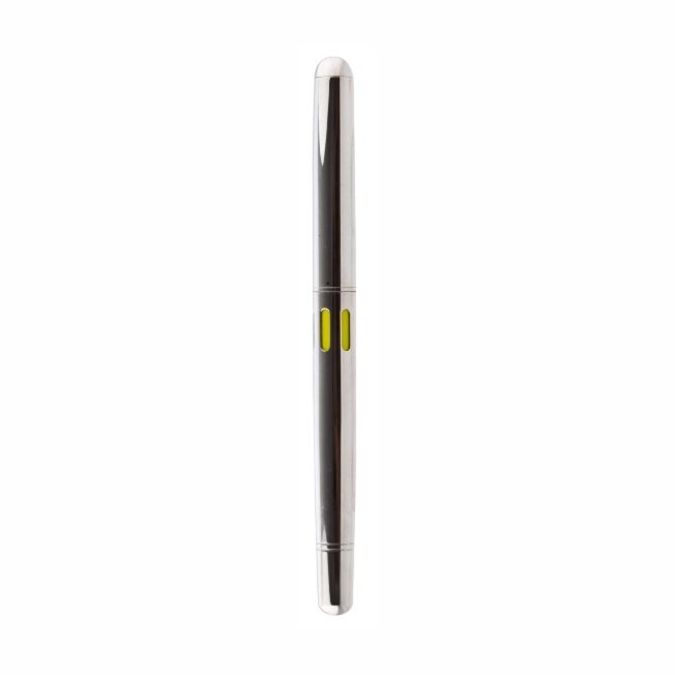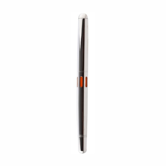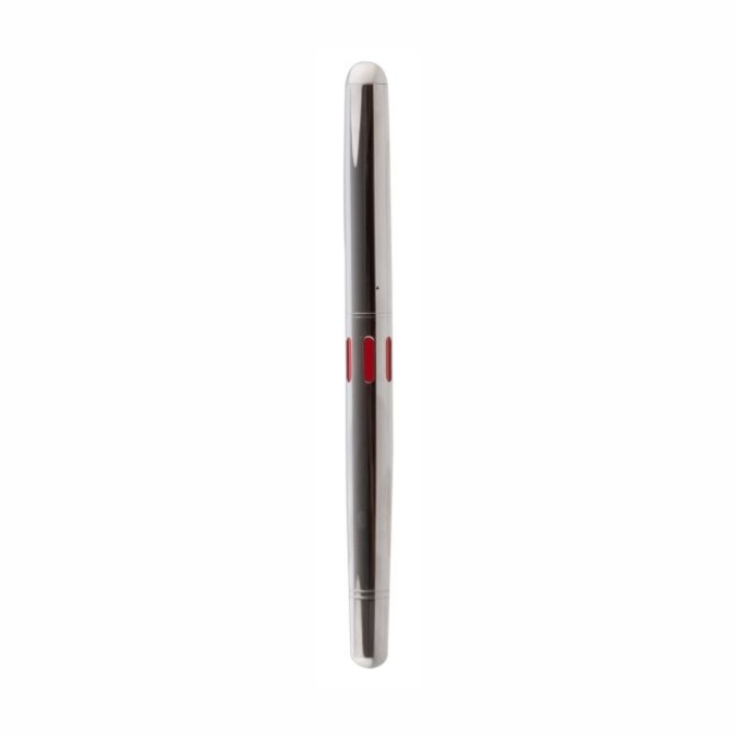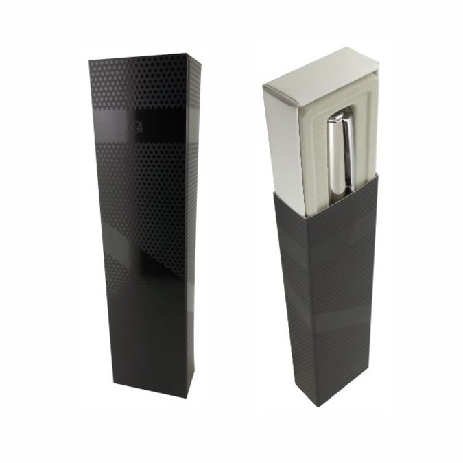 Croma Bolígrafo metálico con tapón de cierre a presión. Acabado cromado en todo el cuerpo. Sutiles detalles de color en ventanillas ovaladas que rodean la parte superior del barril. Escritura de alto desempeño debido a su repuesto japonés tipo roller (a elegir entre tinta negra o azul). Incluye estuche individual.