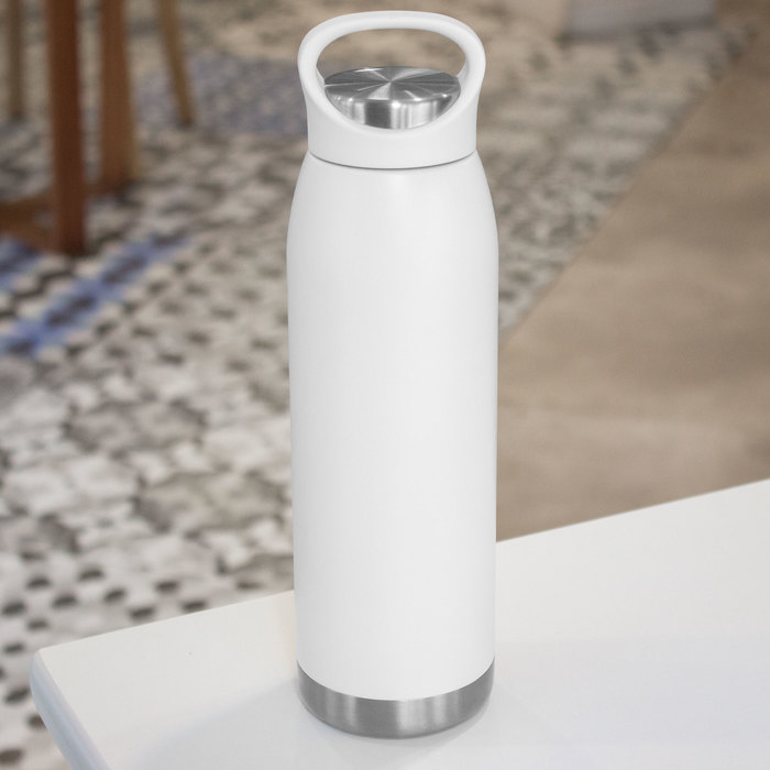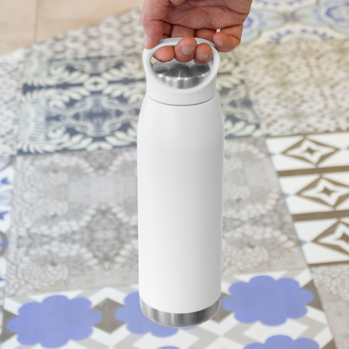 BOTELLA TÉRMICA "GAUDÍ" Botella doble pared, sellada al vacío. Interior en acero 304 y exterior en acero 201. Pintura en colores mate. Tapa combinada en plástico del mismo color de la botella y acero inoxidable 201. Mantiene hasta 12 hs la temperatura de las bebidas calientes y 24 hs de las bebidas frías. Presentación en caja de regalo.